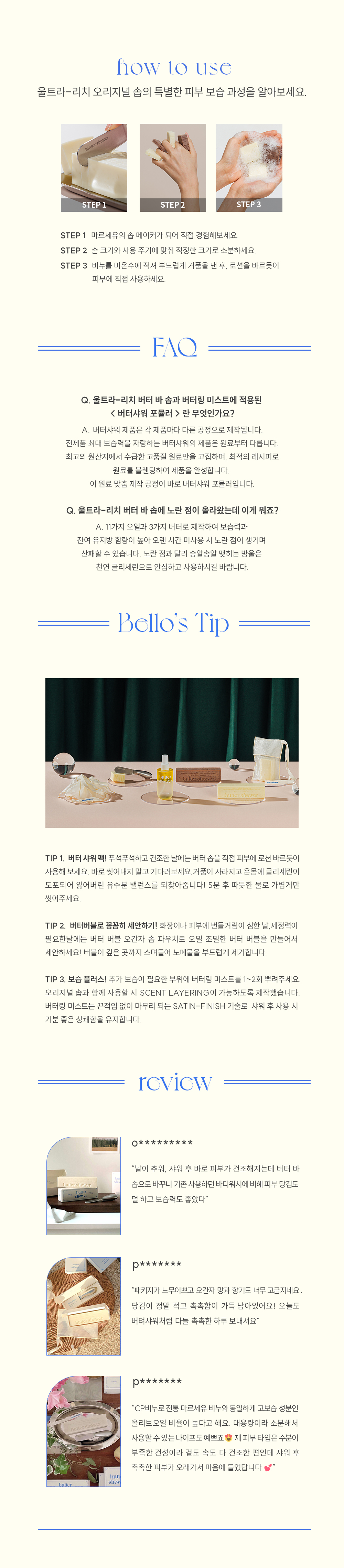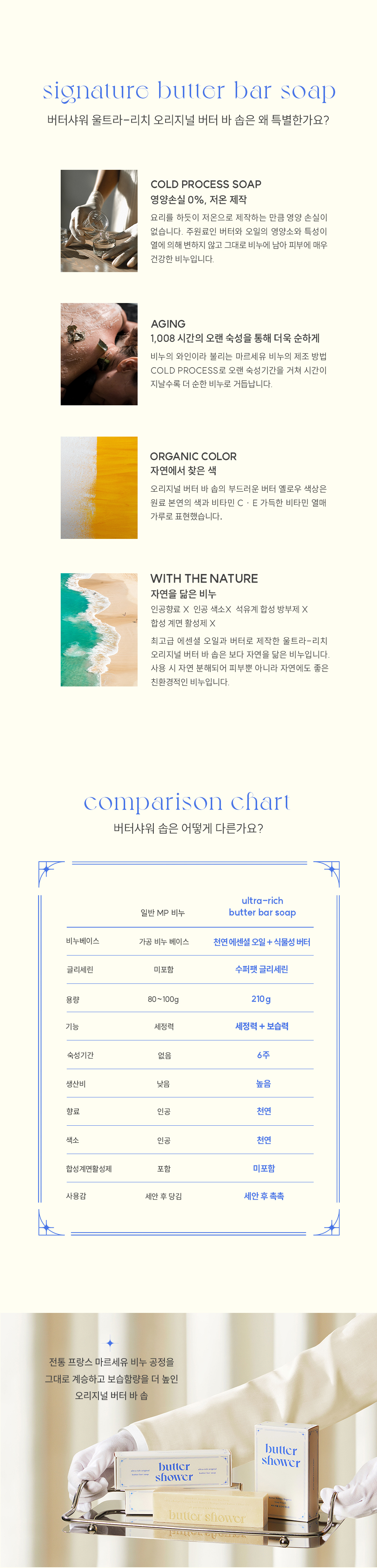 울트라-리치 오리지널 버터 바 솝은 프리미엄 원료로 오랜 숙성 기간을 거쳐 제작된 고보습 CP 비누입니다. 전통 마르세유 비누와 동일하게 형태를 단단히 잡아주는 코코넛오일보다 보습력이 우수한 올리브오일 비율이 높습니다. 그래서 일반적인 비누와 달리 표면이 부드러워 맨살에 로션을 바르듯이 사용할 수 있습니다. 버터와 오일 성분이 피부를 코팅해 속 당김이 적고 샤워 후에도 오랜 시간 동안 피부를 촉촉하게 유지합니다. 세정력과 보습력을 모두 갖춘 버터샤워의 버터 바 솝은 화학 방부제가 들어가지 않아 더욱 신선합니다.